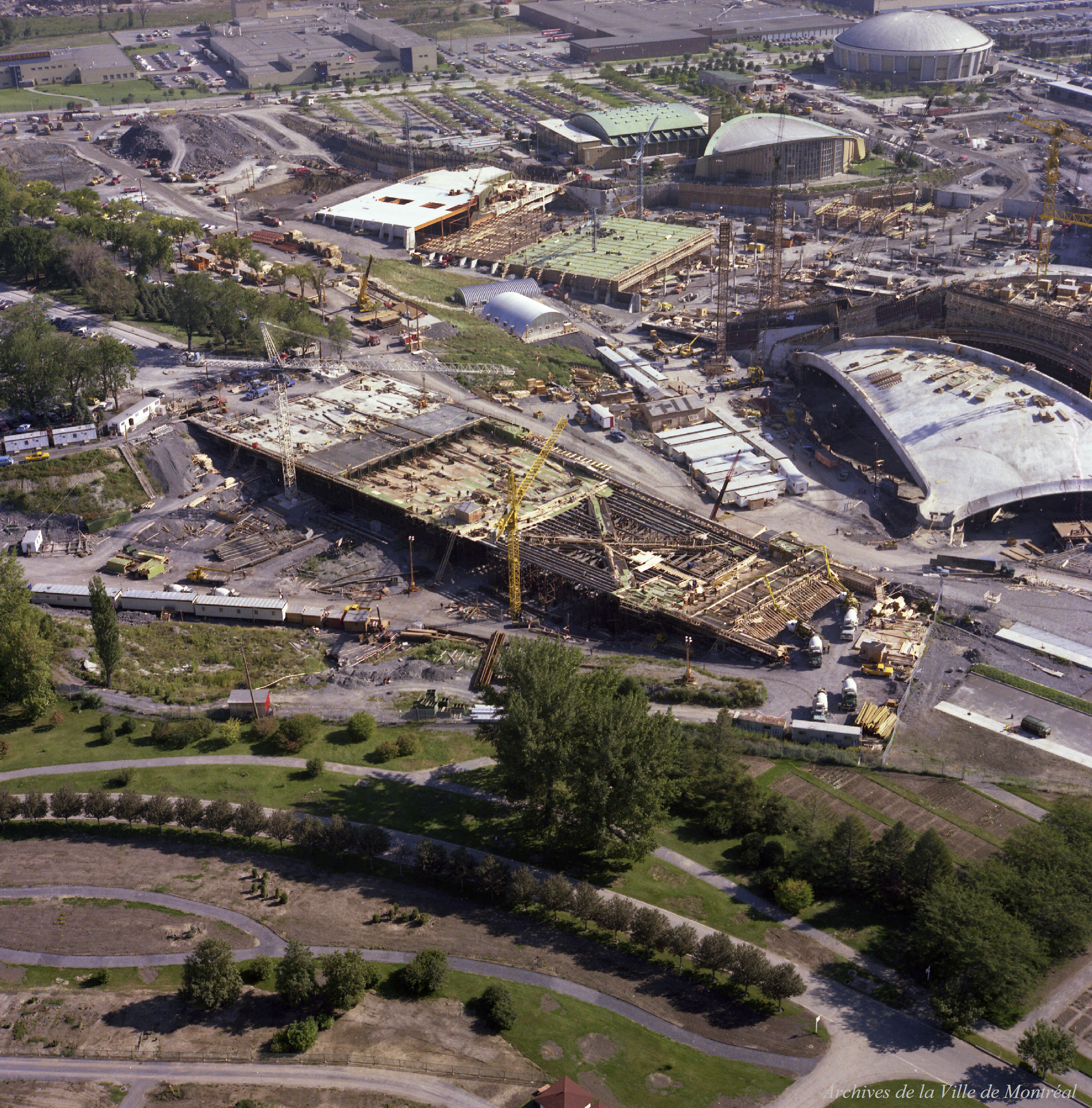 Construction du viaduc de la rue Sherbrooke près du Parc olympique (images 1-15).