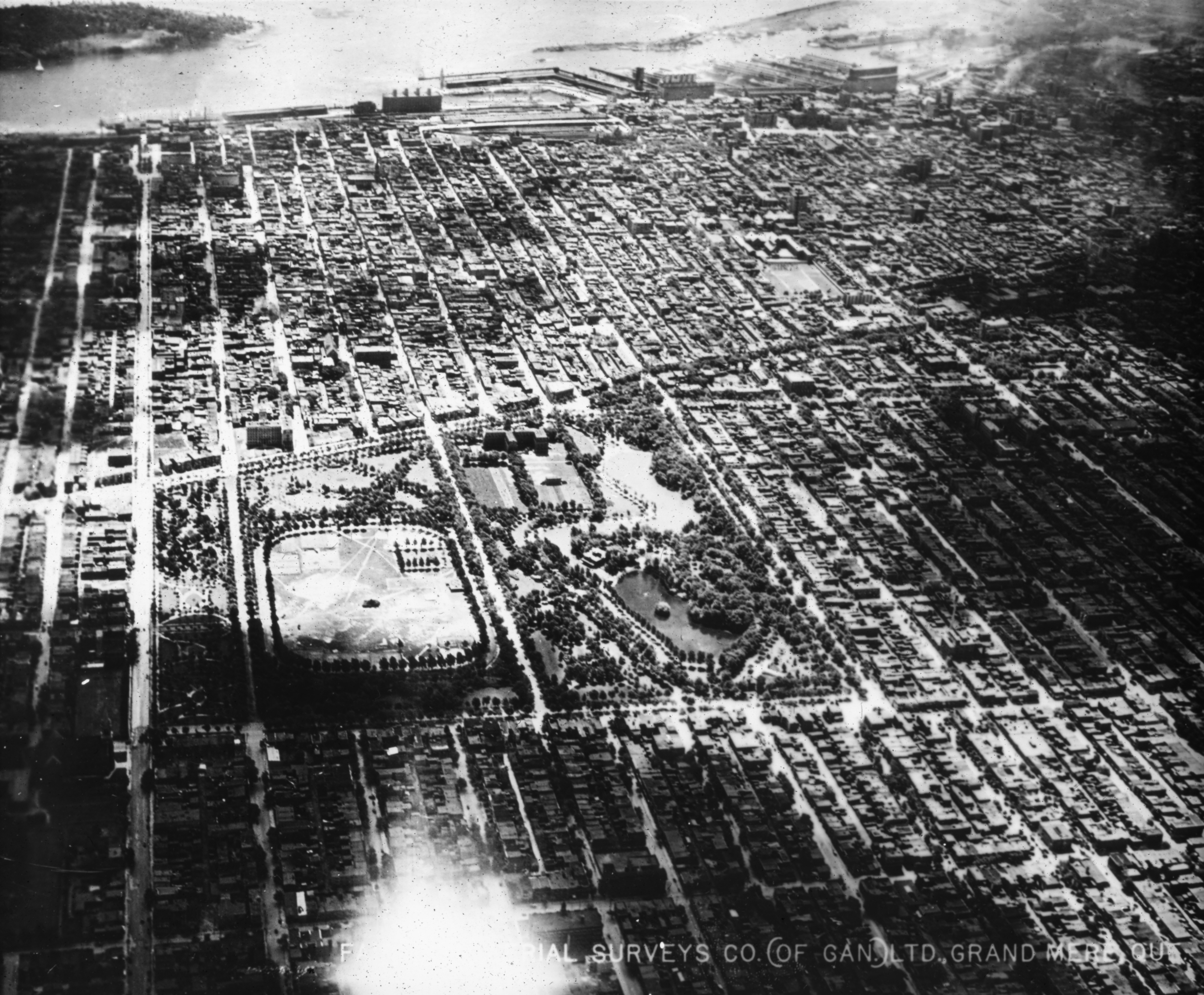 Vue vers le sud, parc Lafontaine, port de Montréal en arrière plan