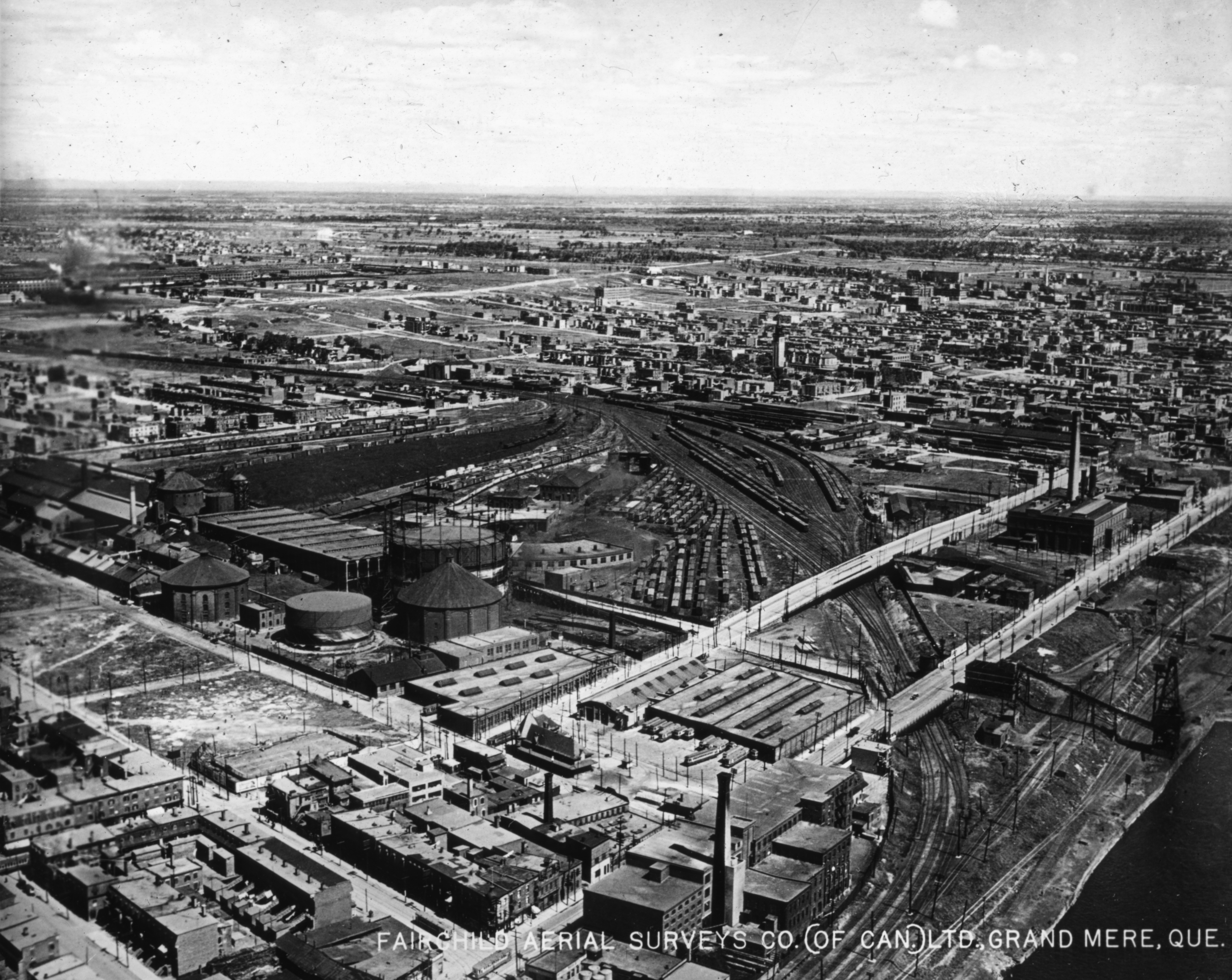 Vue vers le nord-est, secteur industriel près du port de Montréal, rues Sainte-Catherine et Bercy, enclos ferroviaire, secteur de Maisonneuve