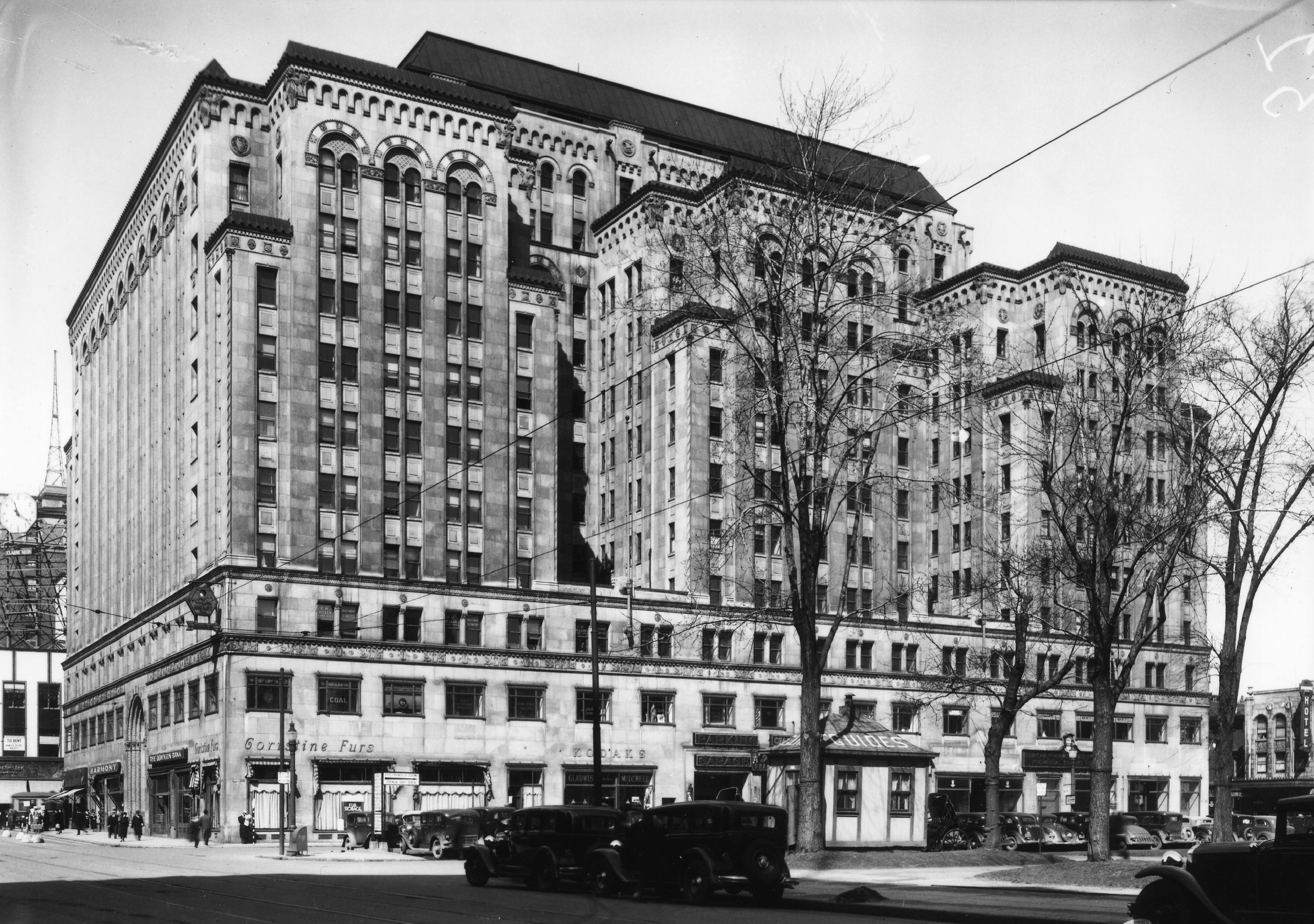 Construit en 1928. On y aperçoit les enseignes commerciales des magasins Harmony, Goristine Furs et Kodaks. On y voit aussi un kiosque d'information de l'Office provincial du tourisme.