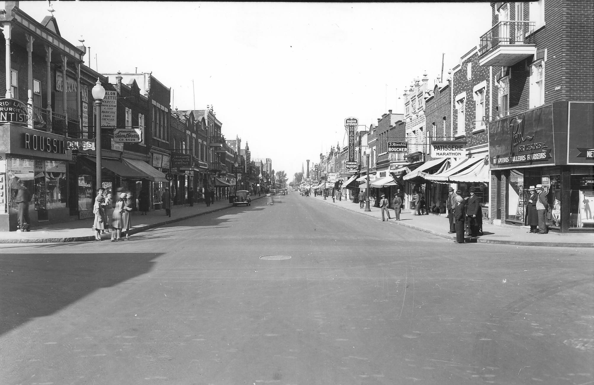 En direction Nord, à partir de la rue Saint-Zotique. On y voit la pharmacie Roussin, le Salon Colette, D.D. Vallière Bijoutier, la boucherie S.Rosenfeld,la Pâtisserie Marathon, les nettoyeurs tailleurs Paul et des enseignes d'autres commerces.